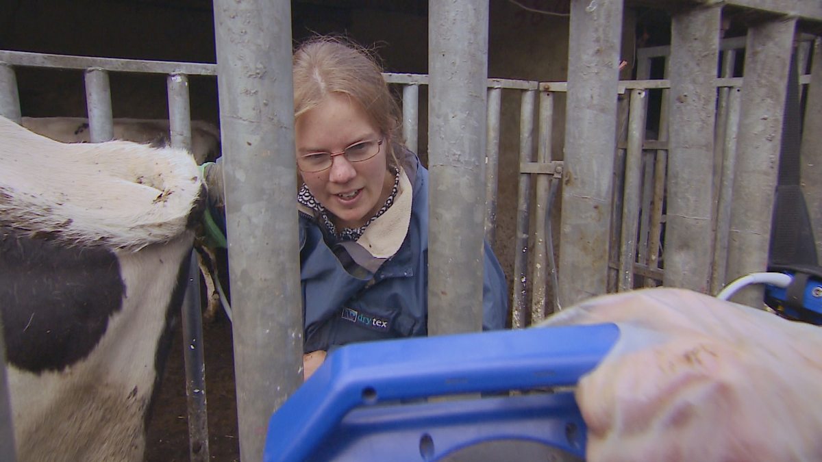 Vets Rebecca and Ifan carry out pre-natal checks on Farmer Milwyn's pregnant cows.