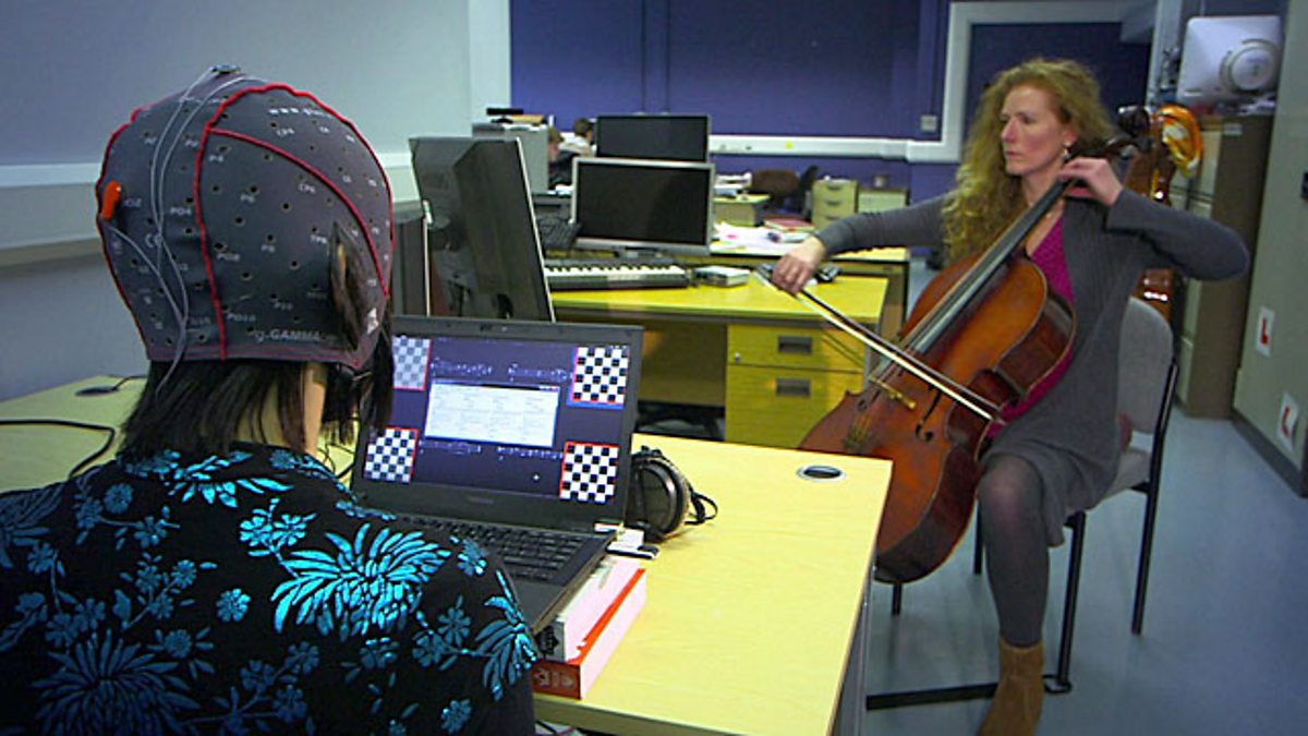 By wearing a brain cap linked to a laptop with a screen of chequered patterns to focus on, her thoughts create music played by cellist Jane.