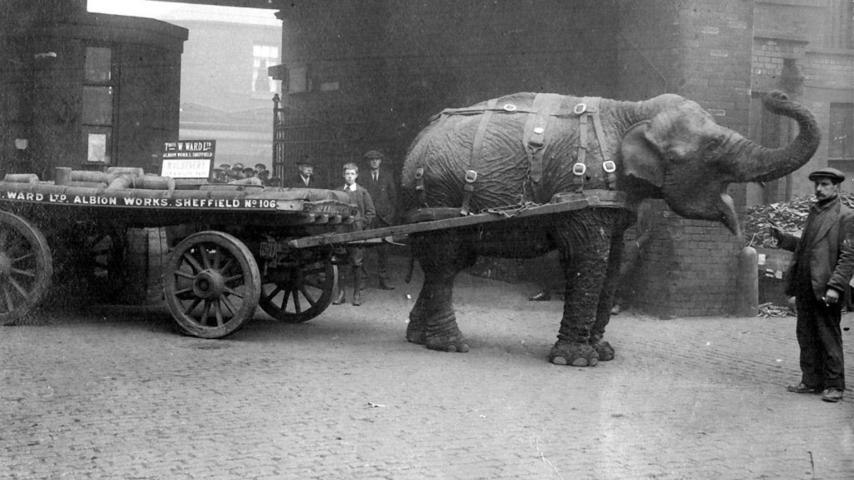 From 1916, an elephant called Lizzie was employed to haul heavy loads of steel and machinery through the streets of Sheffield. She worked for scrap merchant Thomas Ward Ltd based at Albion Works on Savile Street in Attercliffe.
