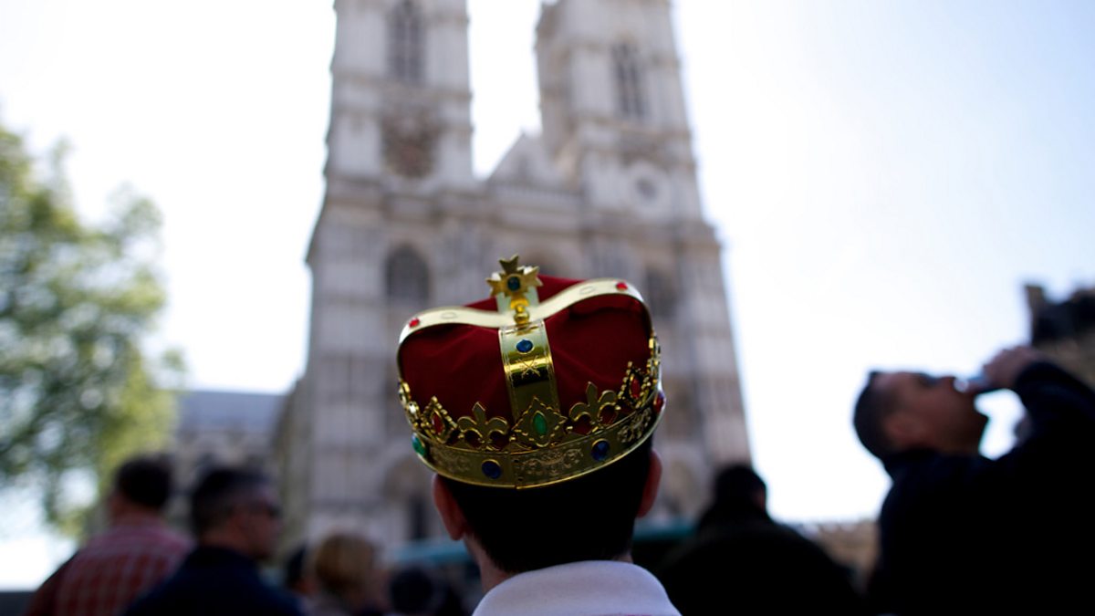 Picture: A man wears a crown outside Westminster Abbey in London, Credit: Andrew Cowie/AFP/Getty Images