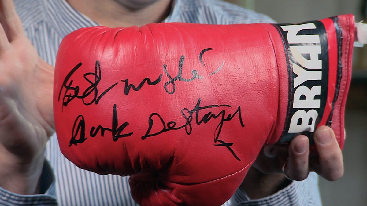 Adam Partridge with a boxing glove signed by Nigel Benn.