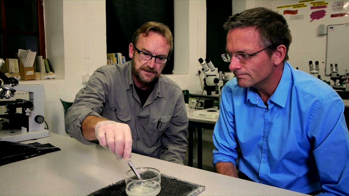 Michael Mosley from 'Infested!' describes the lifecycle of the tapeworm. He visits Kenya to see how the beef tapeworm needs to infect both beef cattle and humans to complete its life-cycle. He collects some infected beef in Kenya, finds the tapeworm cysts and infects himself. Footage of the cysts inside him is seen, followed ten weeks later by footage of the one metre long adult worms. Michael Mosley describes that he cannot feel it inside him despite its length.