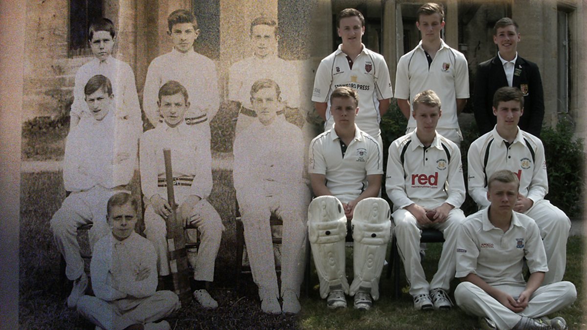 Then and now combined image showing Marling School 2ND XI for the 1913 season (Harry Hogg is in the middle row, second in from right), courtesy of Marling School, with the current Marling School cricket team