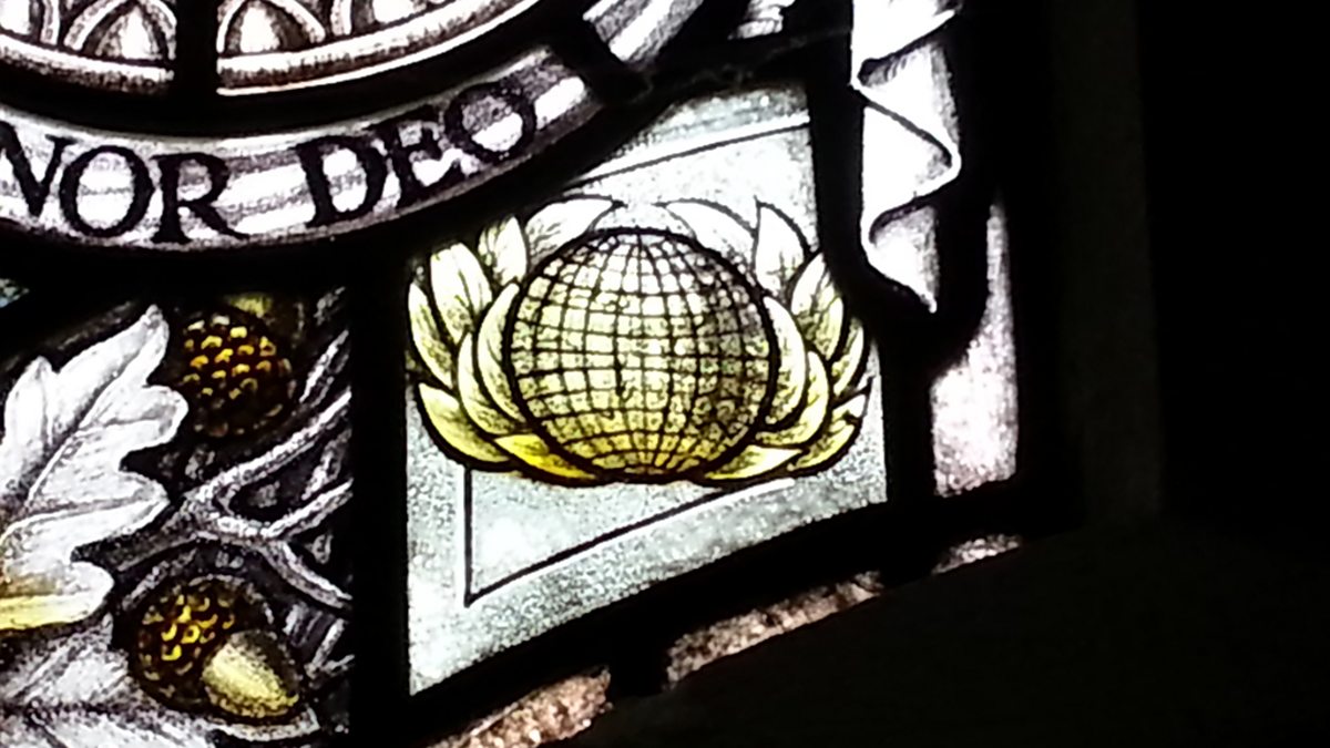 Photograph of the commemorative stained glass window and brass plaque inside the church