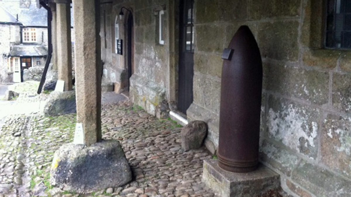 Image shows a shell preserved in Widescombe, presented to the villagers by the National War Savings Committee, in thanks. The plaque reads 'This 15" naval shell was presented by the National War Savings Committee in 1920 to the people of Widecombe in recognition of their efforts during the First World War gathering Sphagnum Moss for use in the treatment of wounds'.