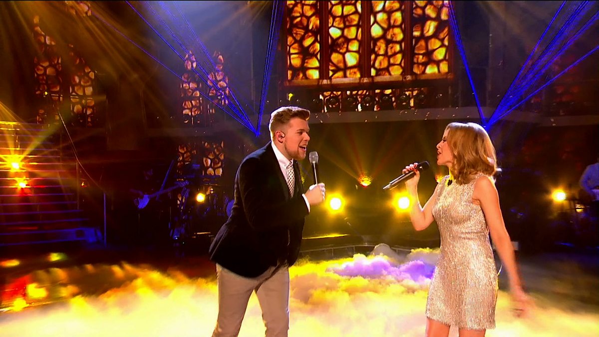 Kylie Minogue and Jamie Johnson perform 'There Must Be an Angel' in the Voice Live Finals