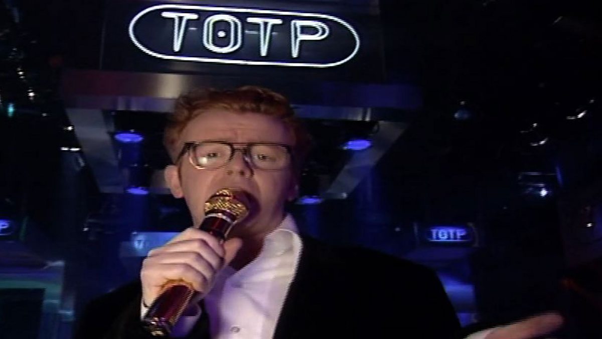 Oasis perform on Top of the Pops on 27 April 1995, as introduced by Chris Evans.