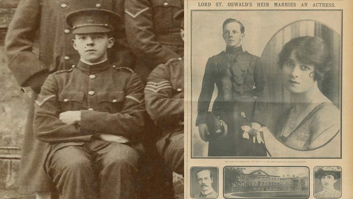 Image shows Rowland George Winn in 1913 (left) and the Daily Mail article in which his marriage to Evie Carew made the headlines in December 1915. Images courtesy of the National Trust.