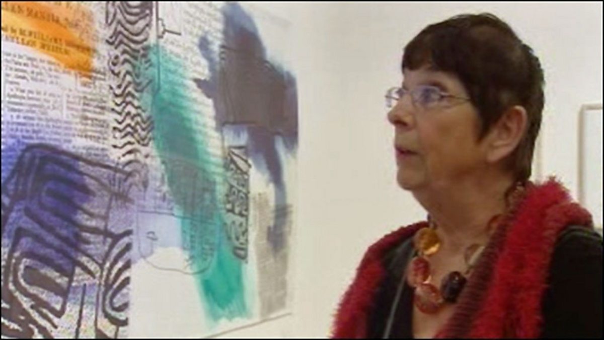 Nia yn sgwrsio efo'r artist Mary Lloyd Jones yn Oriel Nwy, Aberystwyth.