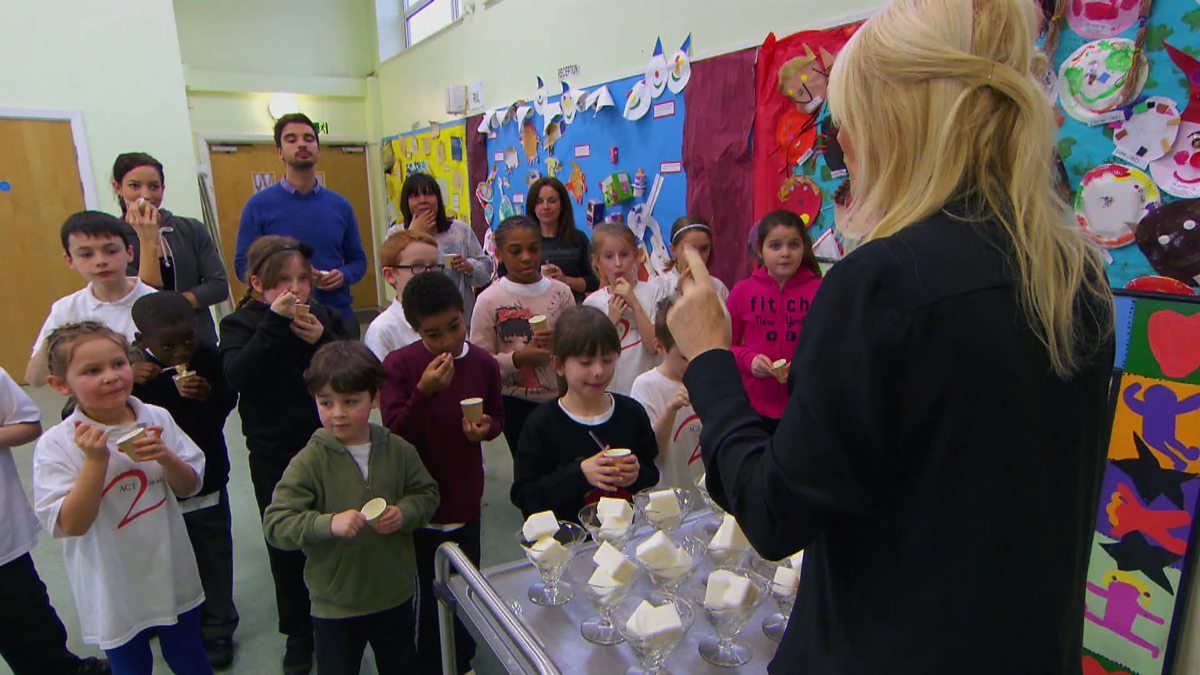 Gaby Roslin shows kids and their parents how much fat content differs between the luxury diary and cheaper soft scoop ice cream brands.