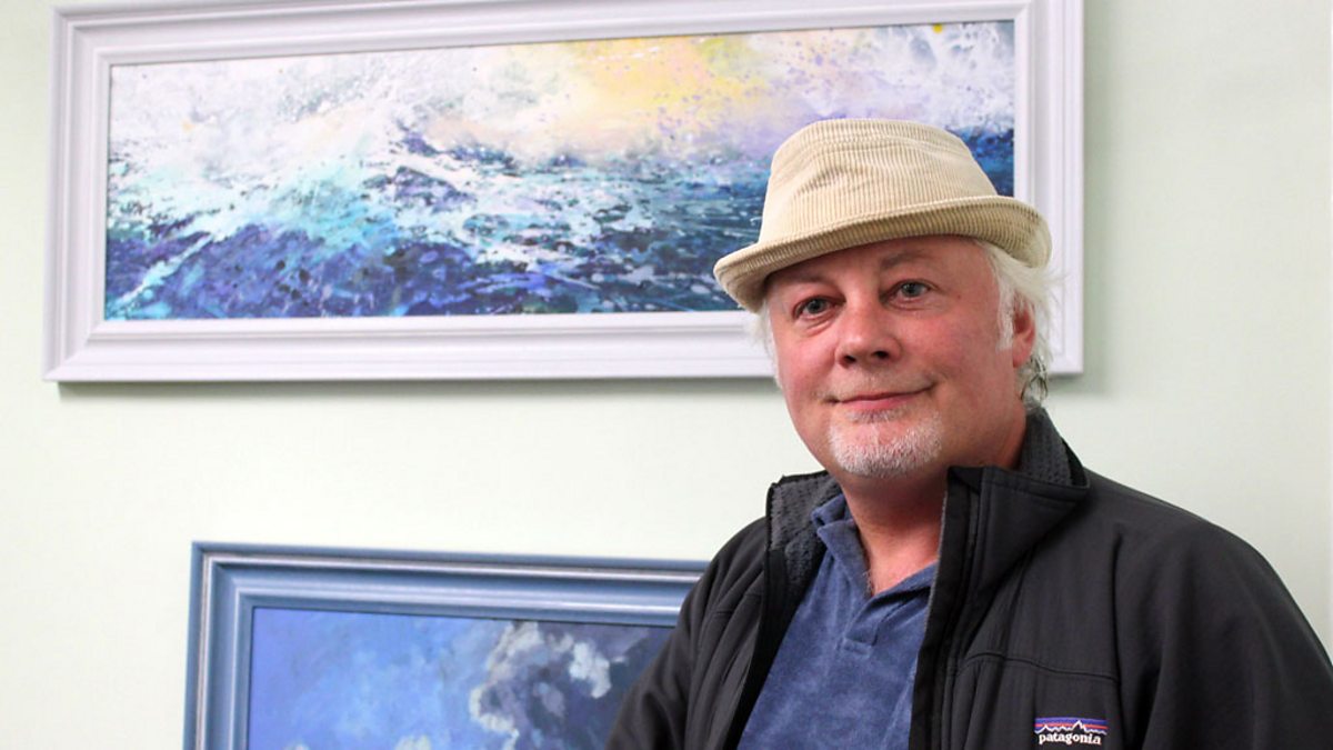Janet Davies a Meirion Jones yn trafod arddangosfa o waith Meirion a'i dad Aneurin Jones.