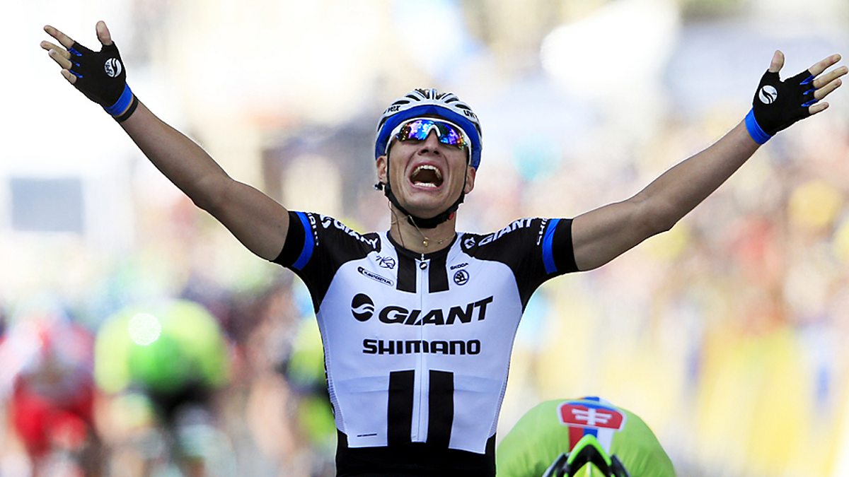 Marcel Kittel wins the sprint on Stage 1 of the Tour de France as Mark Cavendish crashes.