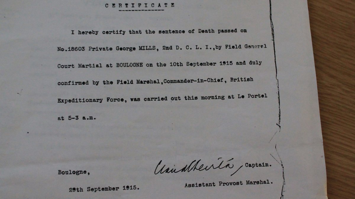 Mills is one of 306 men recorded to have been shot at dawn by British Firing squads. The Duke of Cornwall Light Infantry Museum has a copy of Mills’ Court Marshall and death certificate. Curator Hugo White shares George’s story.