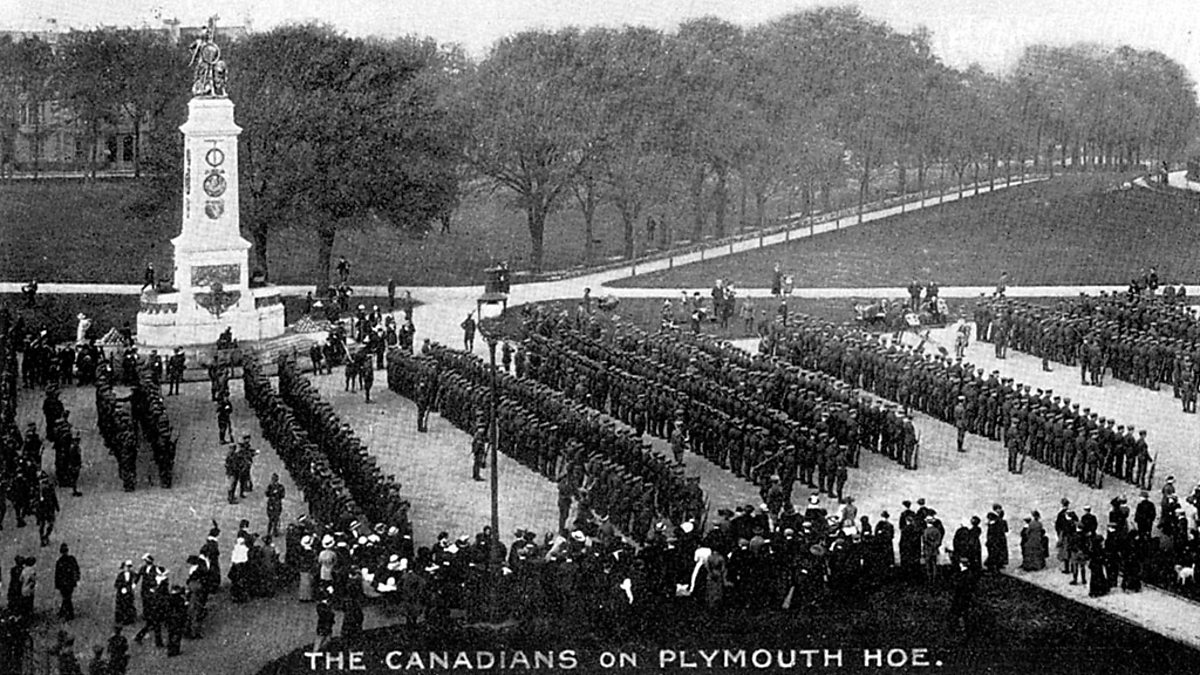 Canada’s first contingent arrived unexpectedly. Their intended destination had been Southampton, but submarine activity had caused the fleet to be redirected into Plymouth.