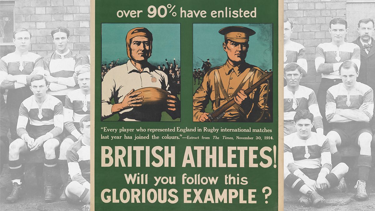 Image: In the background; 1913-1914 Gloucester A squad, courtesy of Gloucester Rugby Club, and in the foreground; a recruitment poster encouraging other athletes to follow suit of rugby players during the war, courtesy of IWM