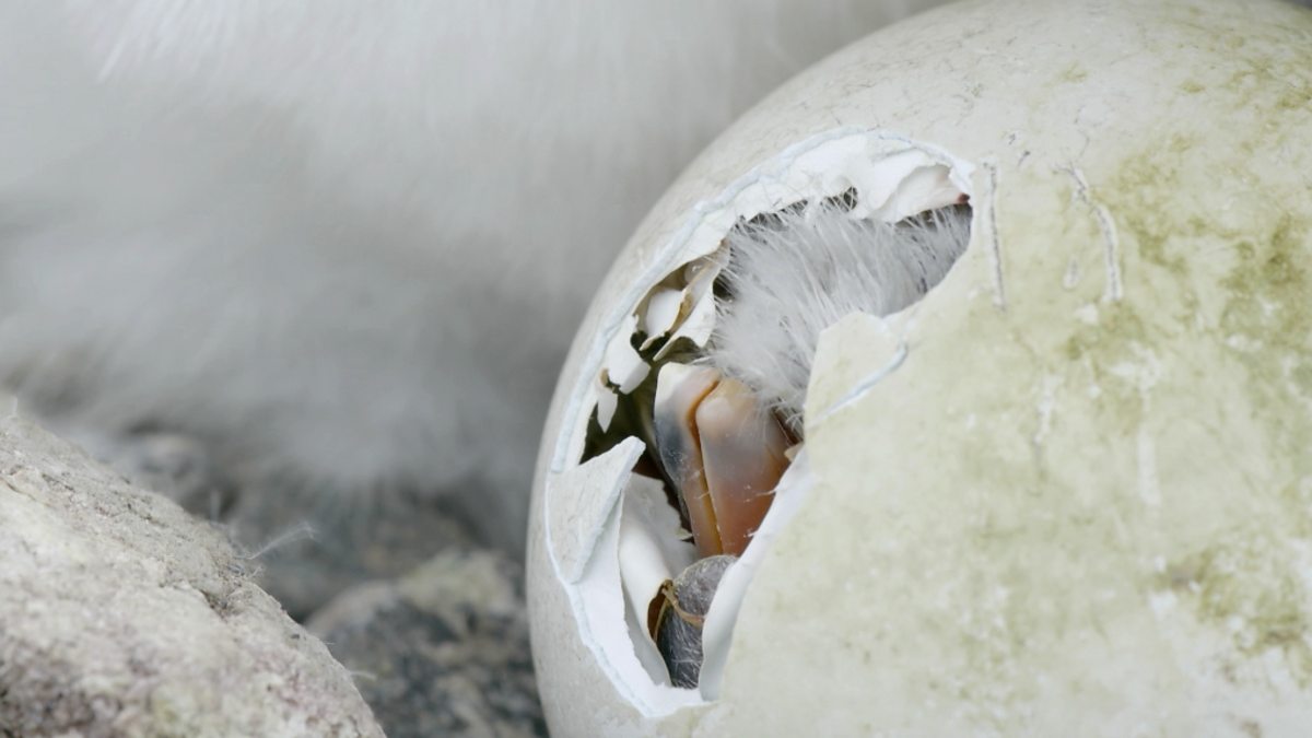 The first gentoo penguin chick emerges from the confines of its shell.