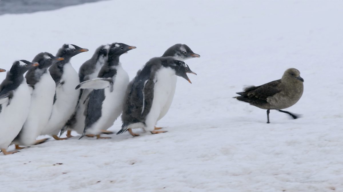 The tables turn and a harassed gang of penguin chicks unite to chase off a skua.
