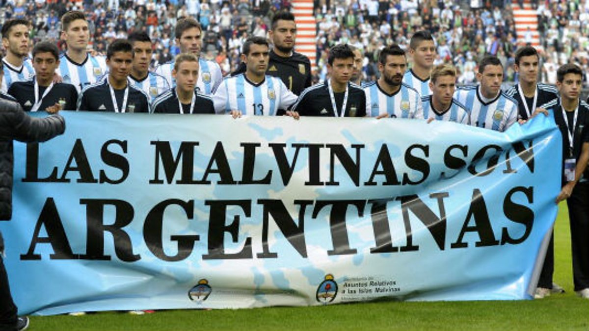 Photo: Argentina's footballers pose for photographers holding a banner reading 'The Malvinas / Falkland Islands are Argentine' before a friendly football match against Slovenia in Buenos Aires on June 7, 2014 (Credit: ALEJANDRO PAGNI/AFP/Getty Images)