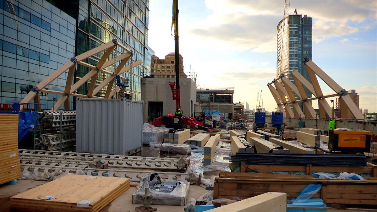 Glulam beams are made by glueing thousands of planks together and cutting them to size. The strength of these beams is stronger than concrete and will form the roof at Canary Wharf.