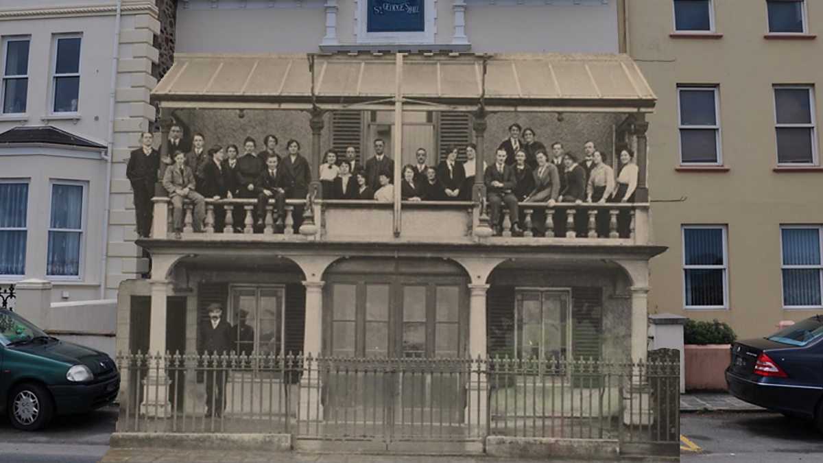 Image: St George’s Hall (1916-1918), courtesy of Priaulx Library, compared to how the building stands today.