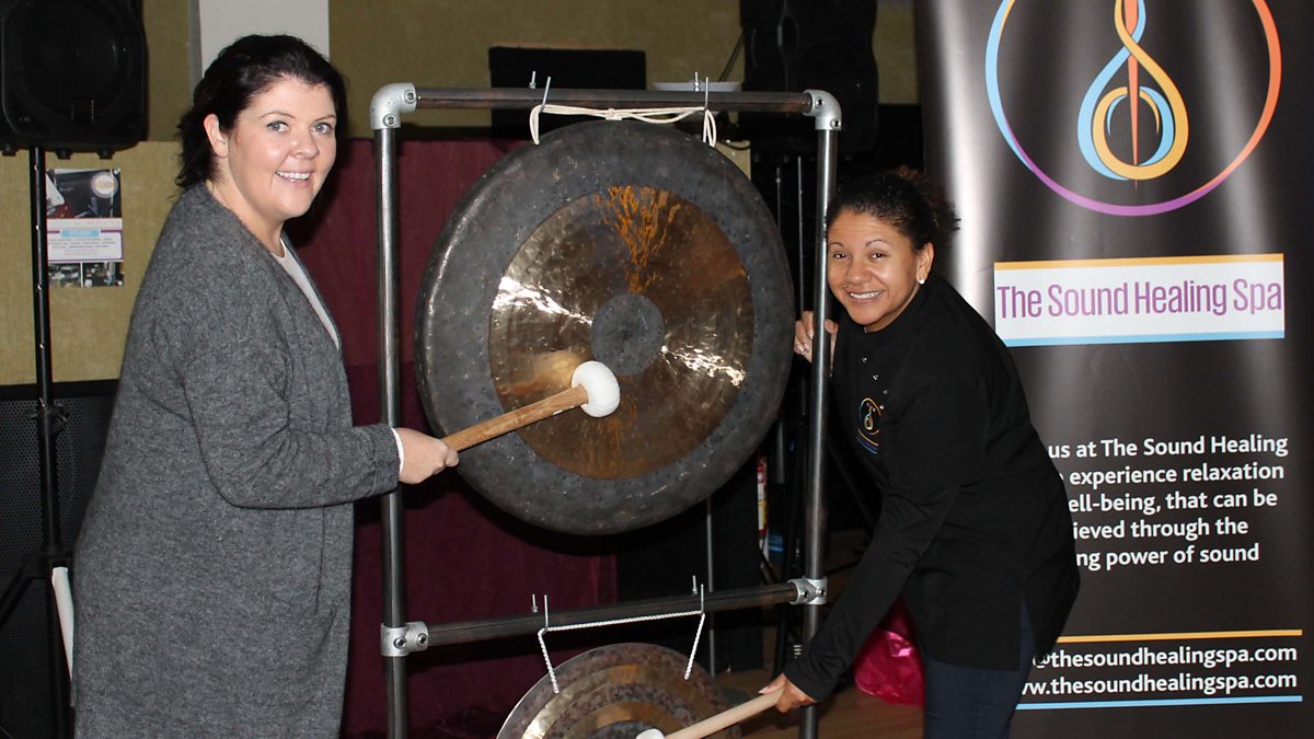 Tessa Greer explains to Lynette how the complementary therapy sound healing works
