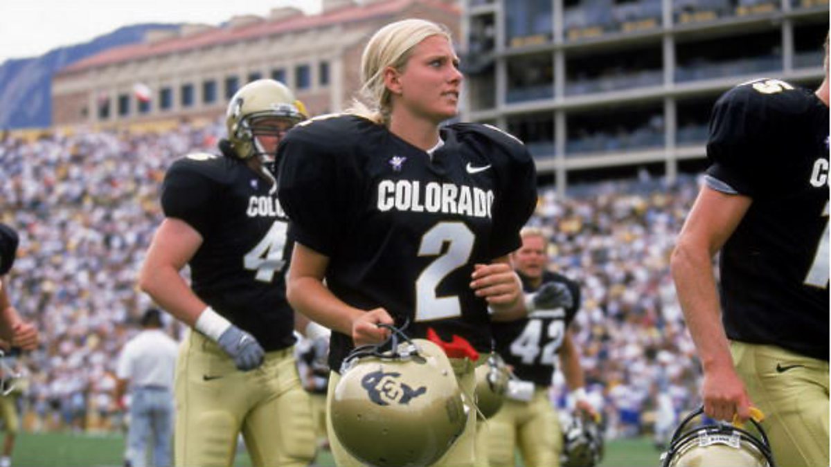 Photo: Katie Hnida in her University of Colorado days heads off the field during a game (CREDIT by Brian Bahr/Getty Images)