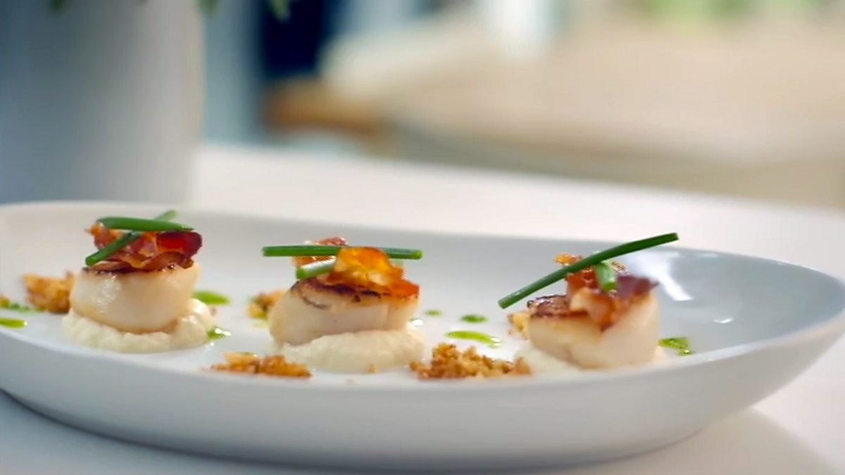 Caramelized scallops on cauliflower purée with pancetta