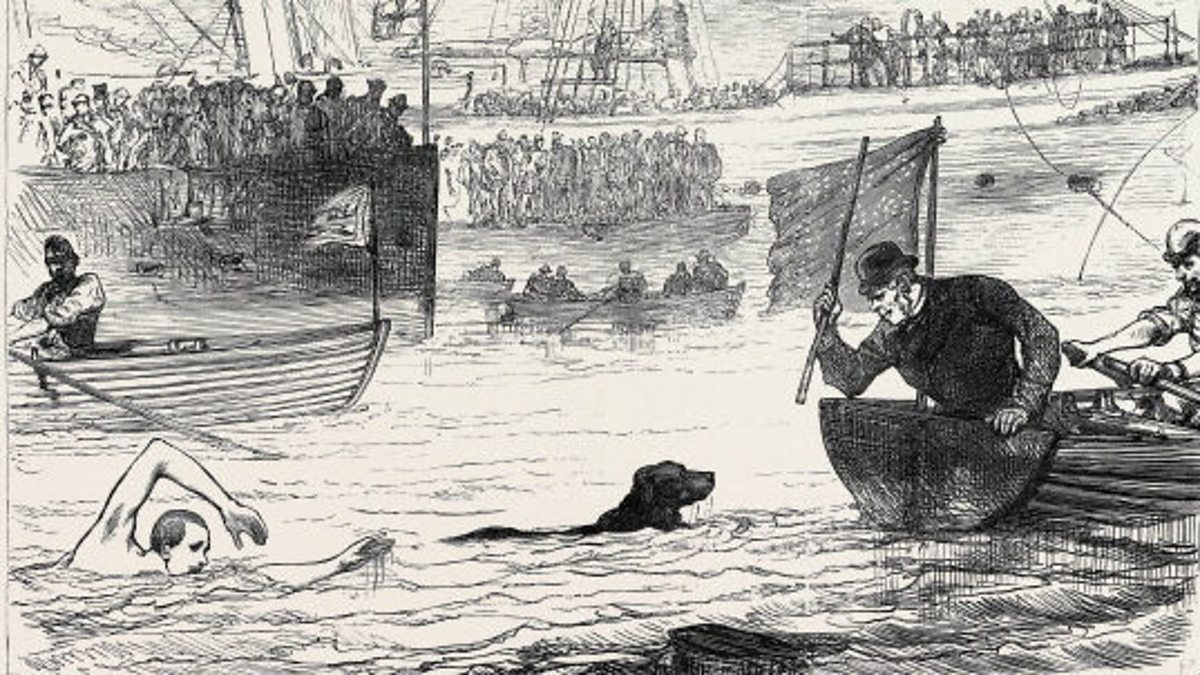 PHOTO: Swimming Match Between A Dog And A Man, 1880. CREDIT: Universal History Archive/UIG via Getty Images