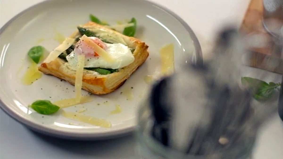 Asparagus and poached egg puff tarts with parmesan and basil
