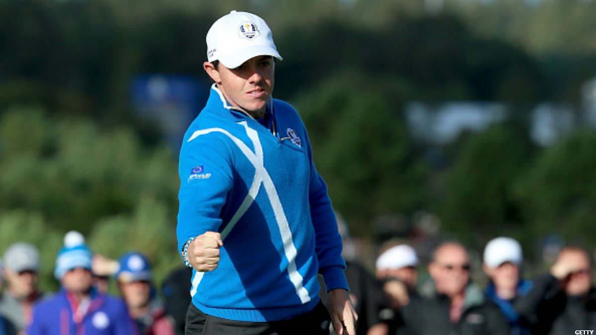 World Number One Rory McIlroy holes a monster putt on the 17th hole at Gleneagles as part of a late comeback with partner Sergio Garcia which snatched a half point for Europe at the Ryder Cup.