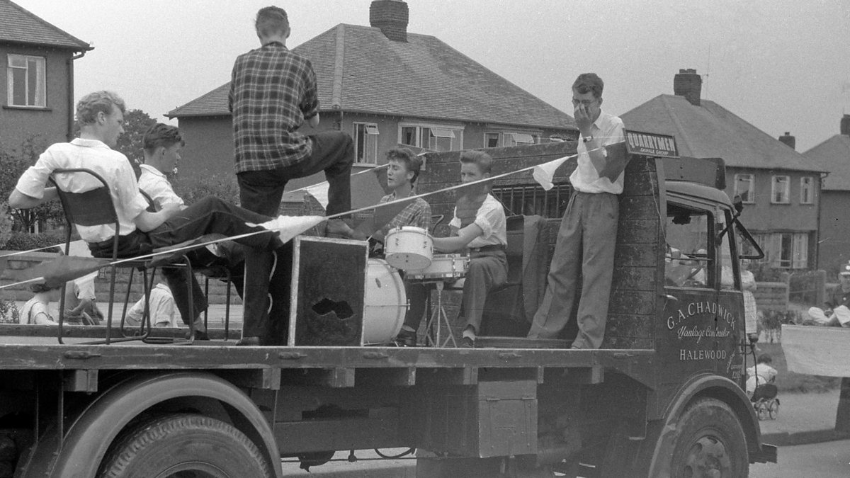 (Photo: The Quarrymen on the back of a lorry as part of a procession round Woolton Village in Liverpool, 6 July 1957. Rod Davis is far right, John Lennon is third from right. Credit: Rod Davis)