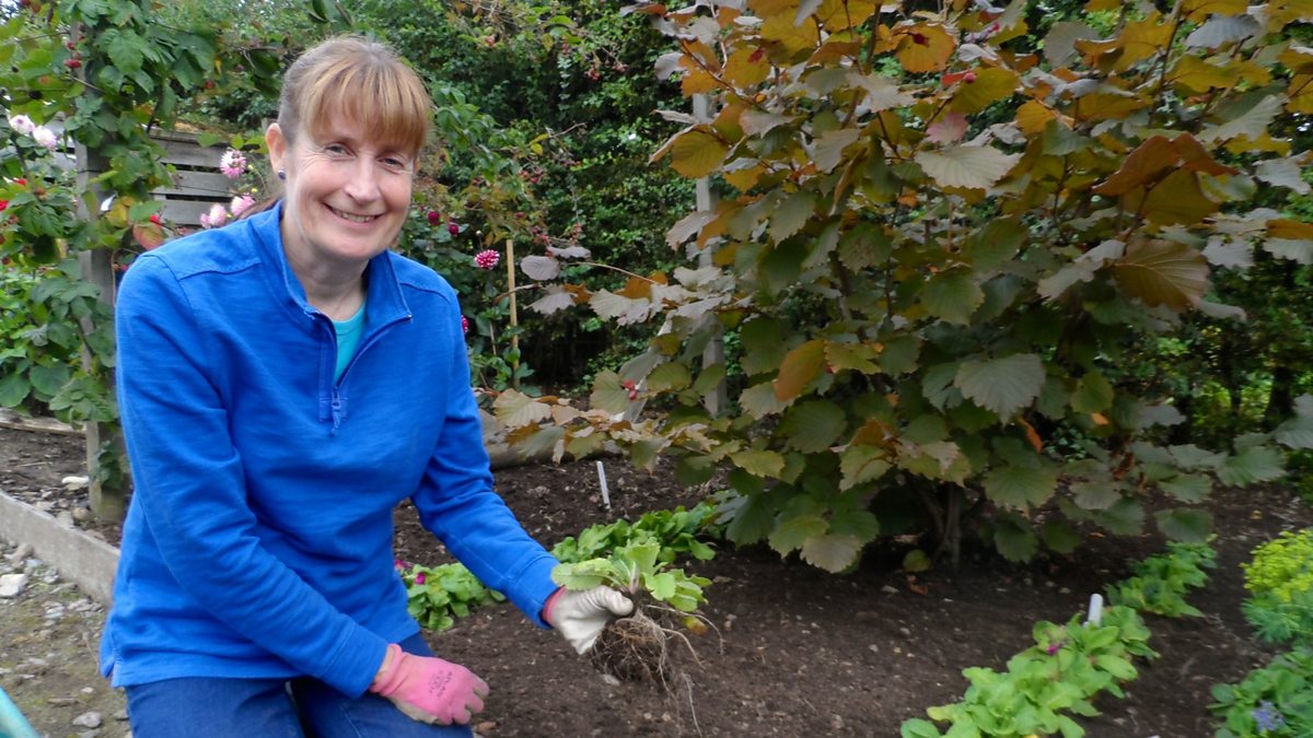 Jim check up on the onions while Carole is looking at the Polyanthus