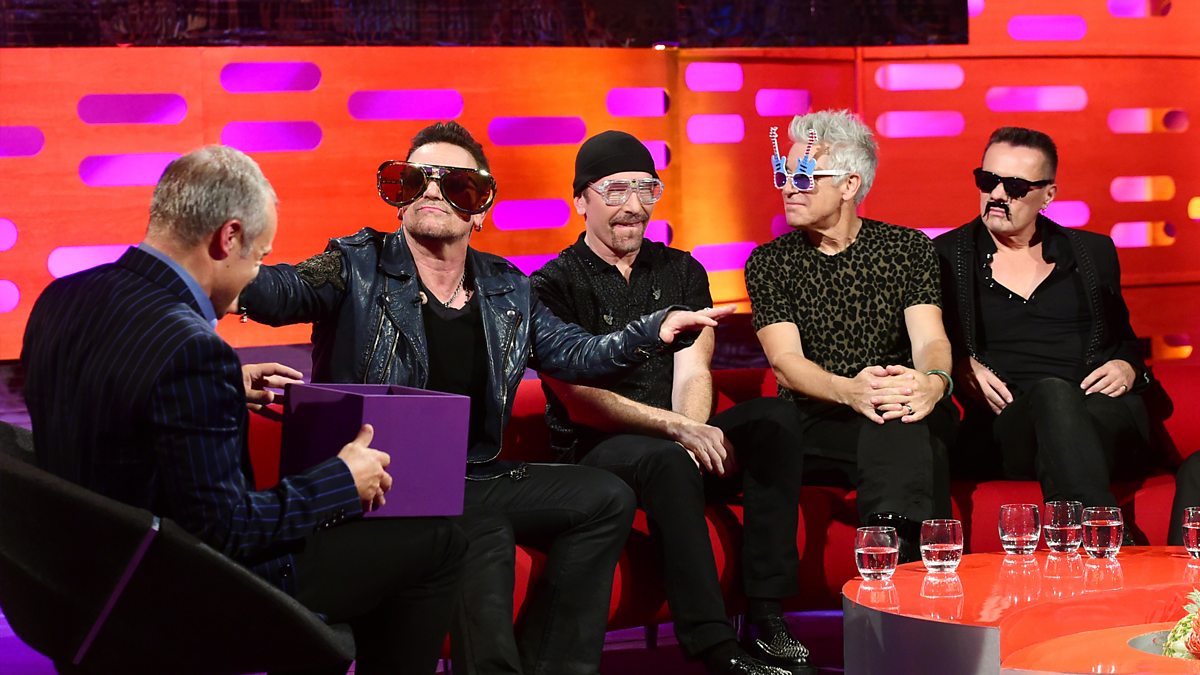 Graham shows some early photos of the band and offers some glasses for them to try on.