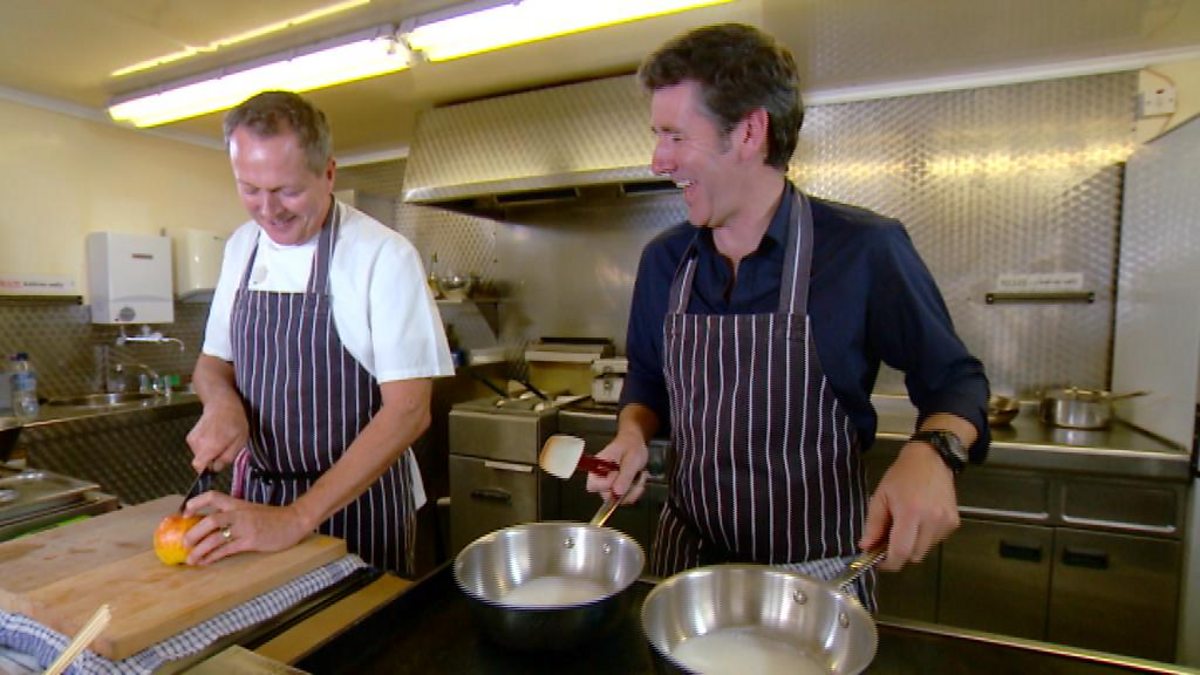 Nick Nairn teaches Dougie Vipond to make caramel for Halloween toffee apples in the Landward Food van. A dangerous occupation apparently!