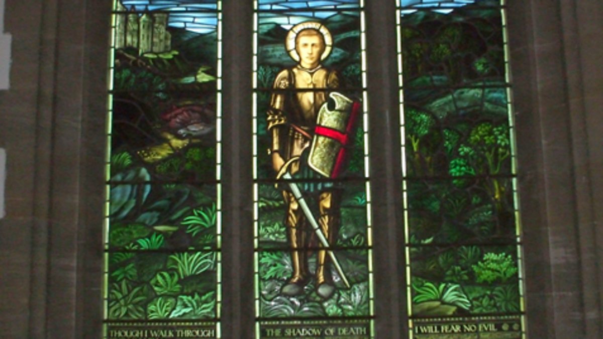 One of the windows in the Church of St Peter and St Paul depicts Saint George with his shield in one hand and a sword in the other. A halo encircles his head and not far away lies the dragon which England’s patron saint has successfully slain. In the distance there’s a castle and all around him is lush green foliage. But look a little closer and the face of St George looks strangely out of place; too clean, detailed and modern-looking for a setting like this.