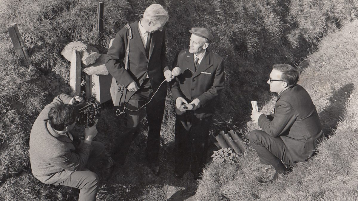 Image: George Cribley returns to the Western Front for BBC Points West in the 1960’s. Les Leach is the cameraman. Picture courtesy of Les Leach.