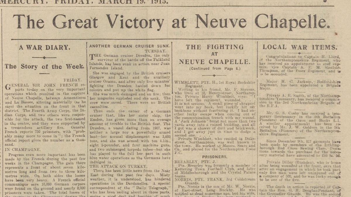 The Northampton Mercury on 19 March 1915 reported: "The Great Victory at Neuve Chapelle". And the Northampton Echo, on 15 May 1915, in an article entitled: "All Going Well: cheerful news from the West", reports: "We are....immune so far from any terrible cataclysm the Germans have been promising us."