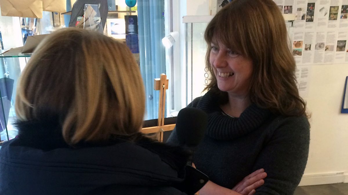 Y gof Ann Catrin yn sgwrsio efo Nia Roberts am ei gwaith.