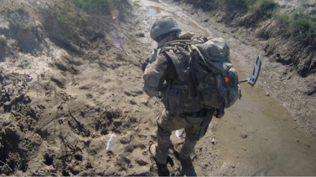 A solider explains his role as vallon man and how he used mine clearing device. UCG shows the solider anxiously investigating a suspect stretch of ground.
