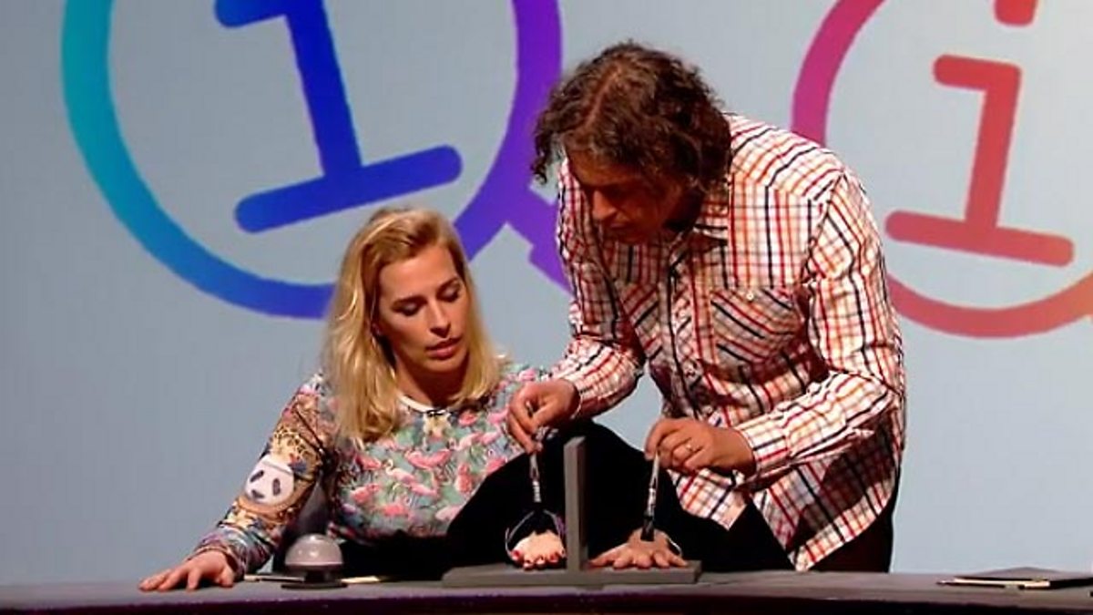 Adam Hills and Sara Pascoe are fooled into thinking that a fake hand is their own.