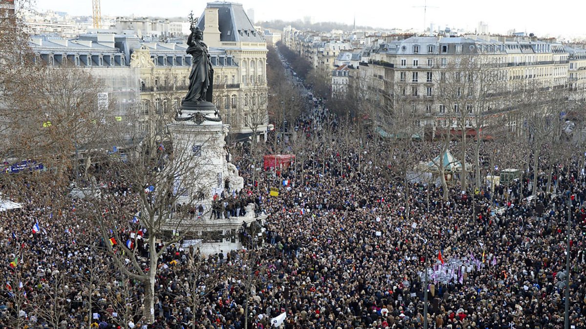 (Photo: People gather on the Place de la Republique in Paris before the start of a Unity rally on January 11, 2015 in tribute to the 17 victims of a three-day killing spree by home-grown Islamists. Credit: Bertrand Guay/AFP/Getty Images)