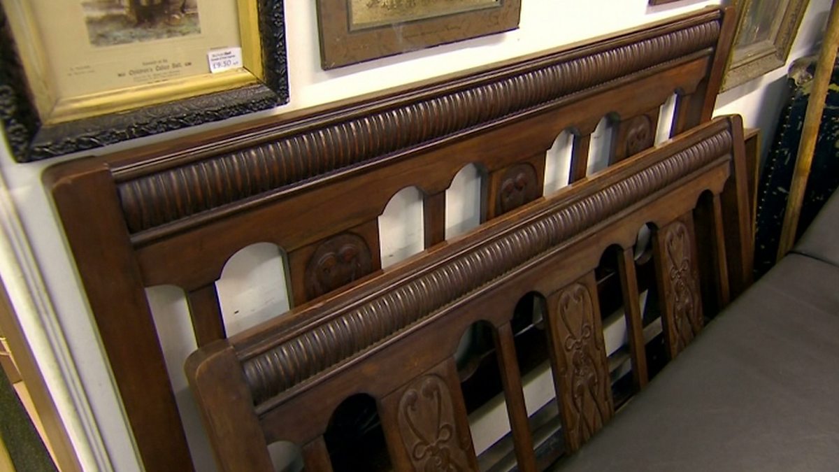 Caroline and the reds look at a wooden Art Nouveau bedframe