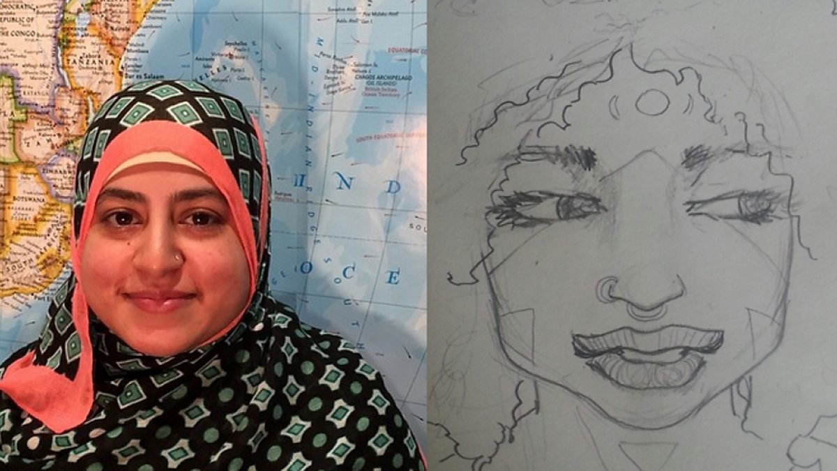 (Photo: Usra Ghazi (left) and Thanaa El-Naggar (right) discuss issues that divide some women in the Muslim community. Credit: Marco Werman/ sketch courtesy of Thanaa El-Naggar)