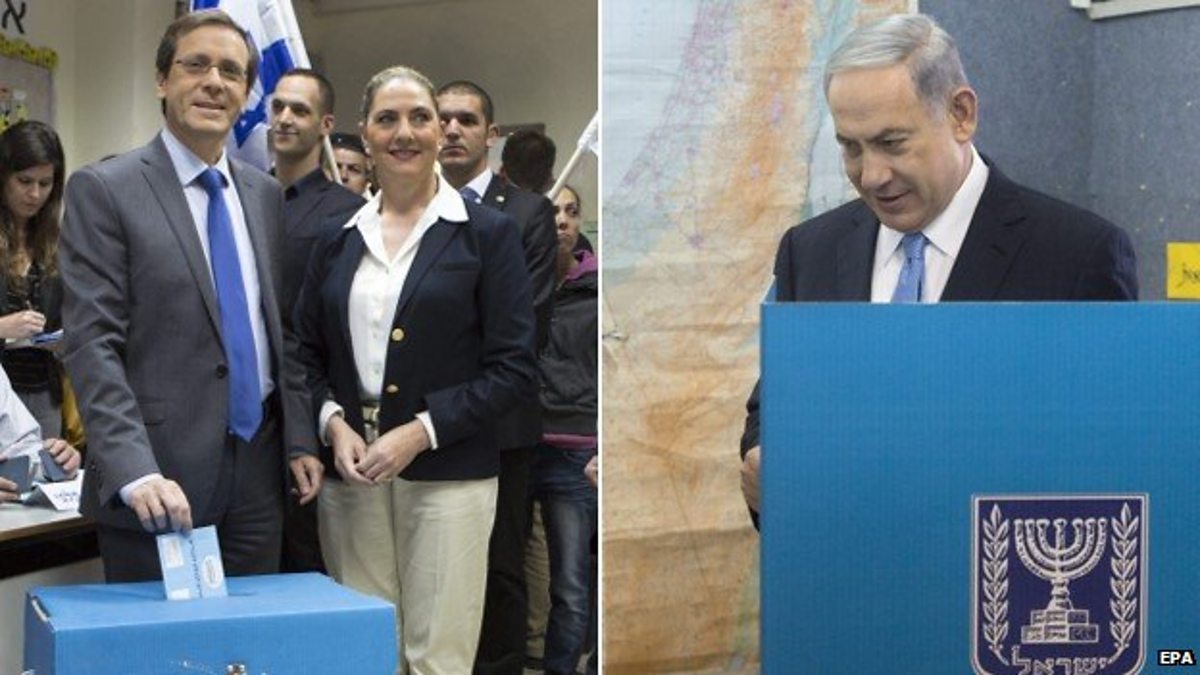 (Photo: Zionist Union party co-leader Isaac Hezcog cast his vote (left) and Benjamin Netanyahu (right). Credit: EPA)