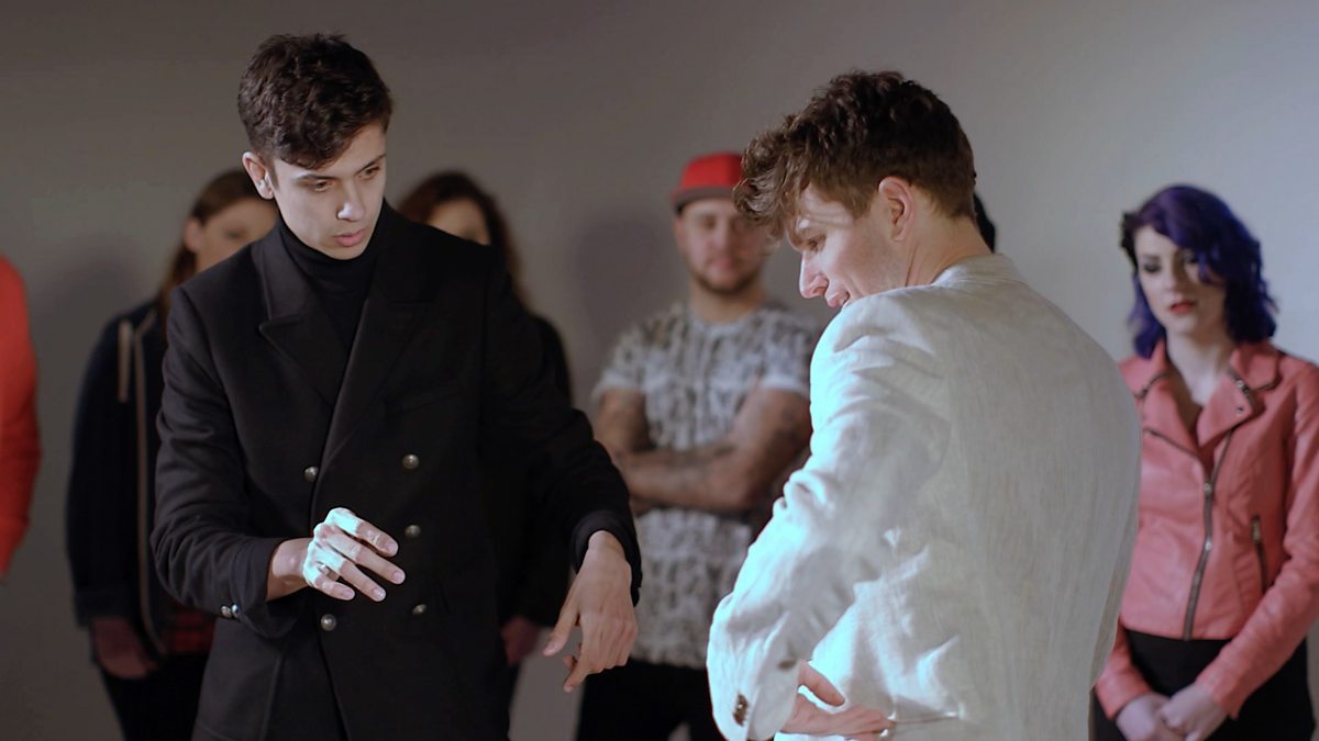 Brilliant magician Ben Hart moves coins in comic Joel Dommett's jacket without his hands.