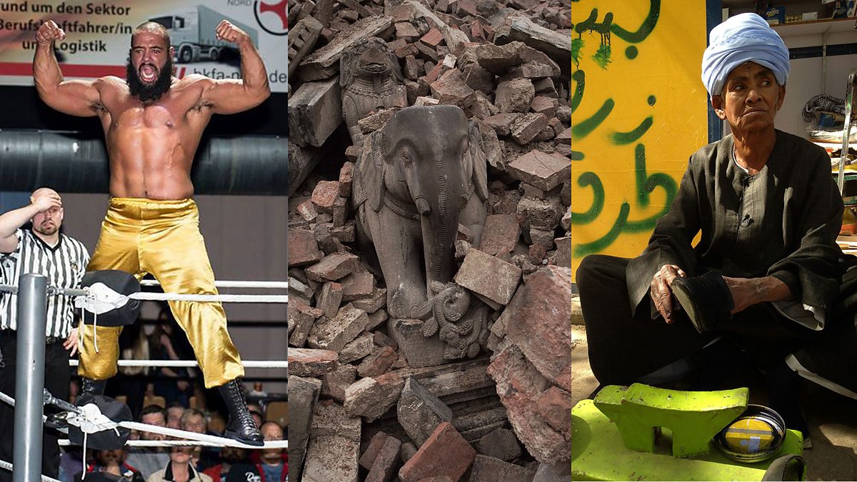 Photo: Wrestler Hakeem Wakur; Nepal earthquake; Egypt's 'Ideal Mum'. Credits: Power of Wrestling/ Uwe Dillenberg/Getty Images/ Claire Read