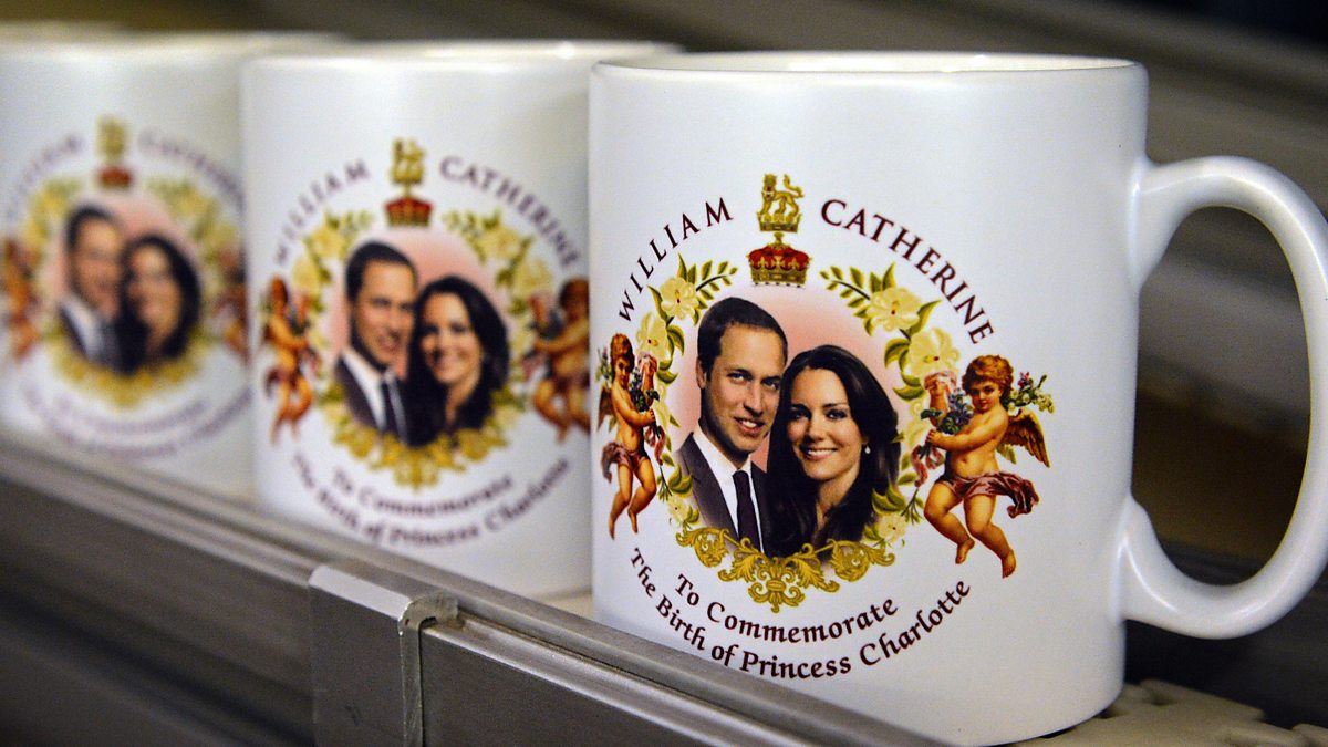 (Image: Mugs celebrating the birth of Princess Charlotte. Credit: AFP/Getty Images)