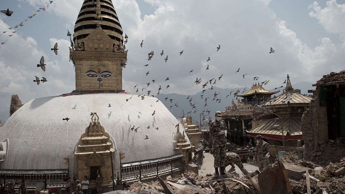(Photo: Nepalese soldiers clear the rubble of the damaged Swayambhunath temple in Kathmandu, following a 7.8 magnitude earthquake which struck the Himalayan nation on 25 April 2015 © Nicolas Asfouri/AFP/Getty Images)