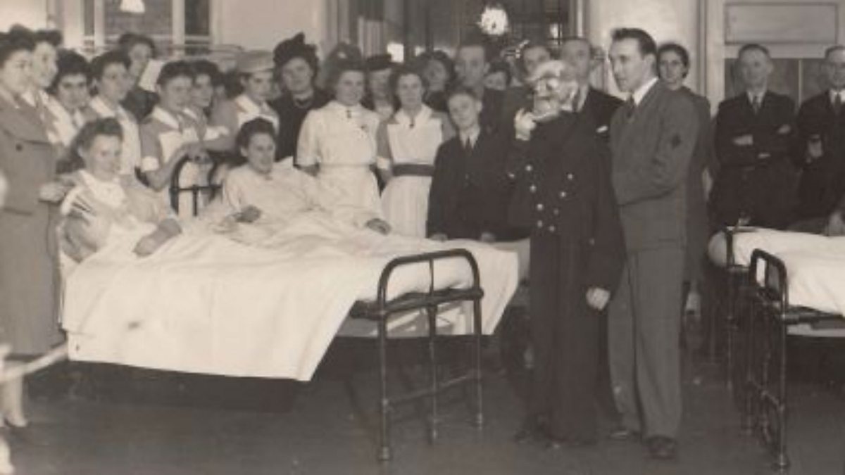 Image: One of the maternity wards at Christmas time. There is a ventriloquist entertaining the patients with doctors, nurses and orderlies gathered around watching. Barbara is the seventh nurse from the left. The year of this photograph is unknown; it is thought to be one Christmas between 1943 and 1947.