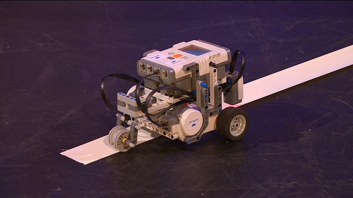 Professor Danielle George demonstrates what feedback loops are by asking a child to match the note that she plays on a swanee whistle. She explains how the child must listen to the note and adjust her hand accordingly, using the feedback from the note she hears to reach the right note. Danielle demonstrates a robot which follows a white line on a black surface by also using a feedback loop. The robot uses an infrared camera to detect the amount of light being reflected off the floor: if the reflection is high it means its positioned over the white tape, and so the robot moves forward, and if the reflection is low it means the robot has deviated from the tape and so the robot moves left or right to find the white tape again. This is an example of a simple feedback loop, as the robot uses the incoming information, and reacts to it, to remain on its course.